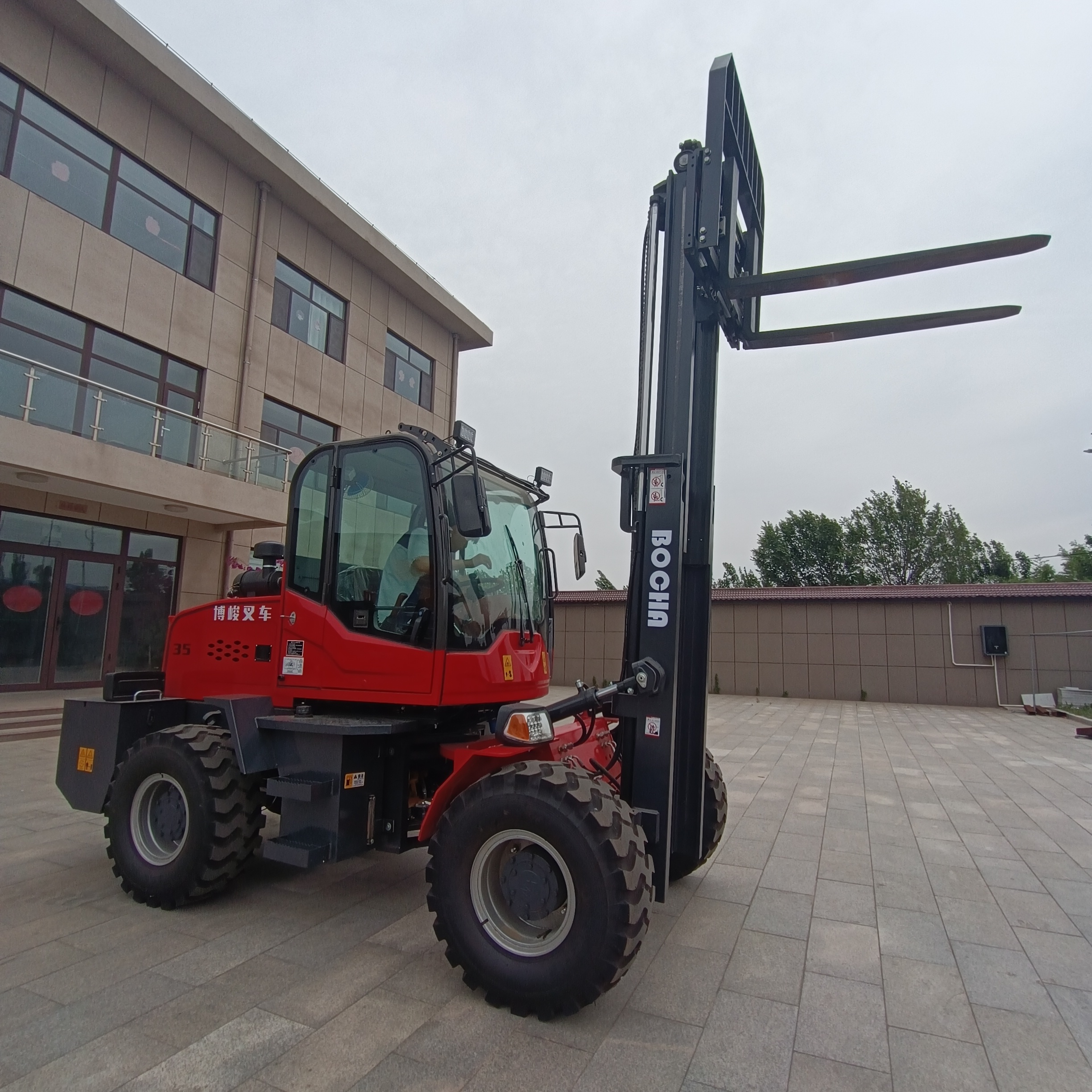 博峻叉車可以讓你不再為此糾結犯難 ,咱廠生產的鉸接式4驅越野叉車經過專業的設計成功的把車身的尺寸縮短成3.6米,龍門架做成三階4米的,靜止高度只有1.97米,而且三節門架還不影響在地下室內舉升物品,選擇博俊越野叉車它適合于全地型工作。